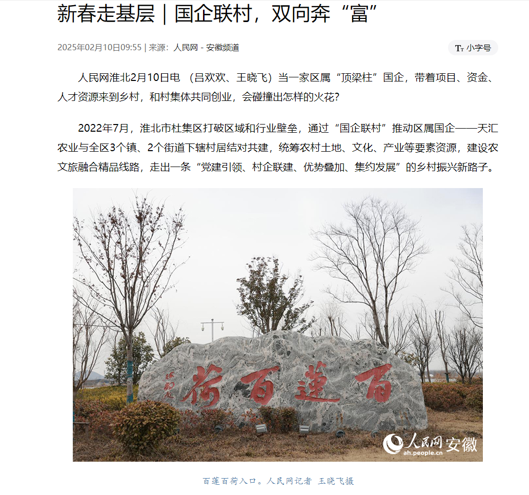 在杜集區(qū)的鄉(xiāng)村振興實踐中,在集團公司的戰(zhàn)略引領(lǐng)與資源支持下,與鄉(xiāng)村緊密攜手,天匯農(nóng)業(yè)與全區(qū)3個鎮(zhèn)、2個街道下轄村居結(jié)對共建,統(tǒng)籌農(nóng)村土地、文化、產(chǎn)業(yè)等要素資源,建設(shè)農(nóng)文旅融合精品線路,走出了一條獨具特色的發(fā)展之路, 近日,人民網(wǎng)在新春走基層系列報道中,聚焦淮北市杜集區(qū)的“國企聯(lián)村”模式,對淮北市天匯農(nóng)業(yè)發(fā)展有限公司進行了重點報道。